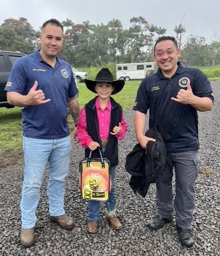 In addition to the rodeo events, Hawai‘i Police Department Hilo Community Policing Officers distributed swag bags and prizes to children in attendance. Officers also engaged with participants and their families, providing an opportunity for keiki and community members to interact with their local officers while enjoying the event.